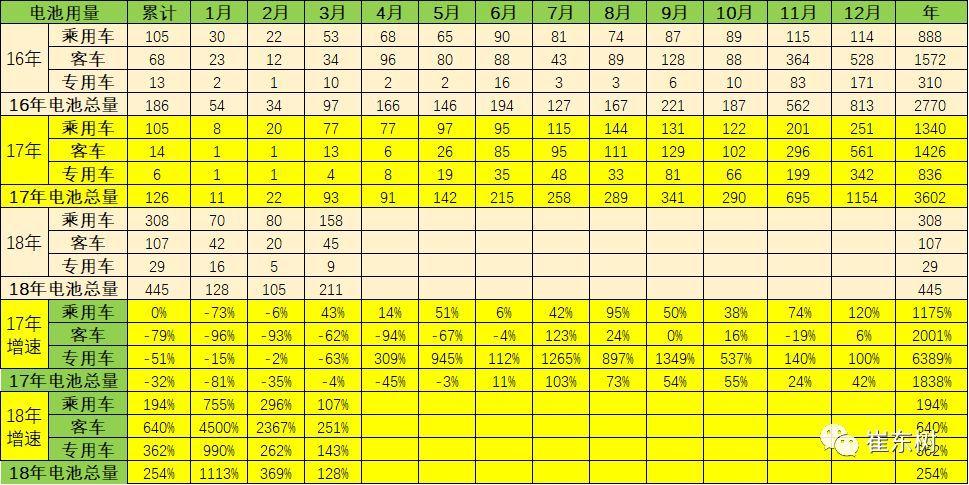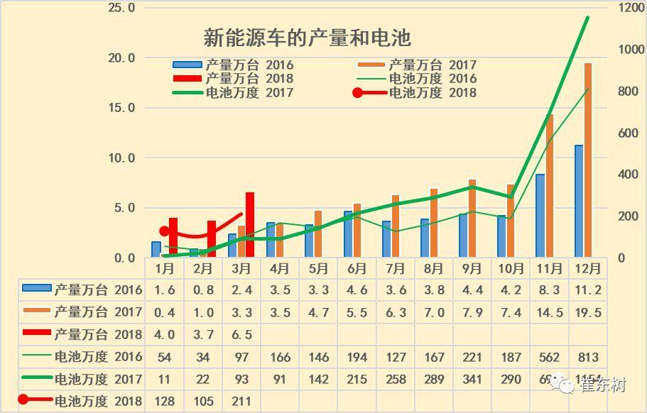 根據(jù)崔東樹個(gè)人測(cè)算,按照汽車生產(chǎn)合格證數(shù)據(jù):2018年3月新能源汽車產(chǎn)量6.5萬臺(tái),增長(zhǎng)97%;電池裝機(jī)總電量約211萬度,同比增長(zhǎng)128%。由于1-2月的年初搶裝特征使新能源汽車產(chǎn)量爆發(fā)增長(zhǎng),3月的產(chǎn)量增長(zhǎng)是令人振奮的。從3月的汽車走勢(shì)看,電池需求和整車數(shù)量都是較好增長(zhǎng)狀態(tài),17年3月的產(chǎn)銷量很低,18年新能源車新補(bǔ)貼政策啟動(dòng)的拉動(dòng)效果較好。 2、18年新能源車電池需求恢復(fù)正增長(zhǎng)