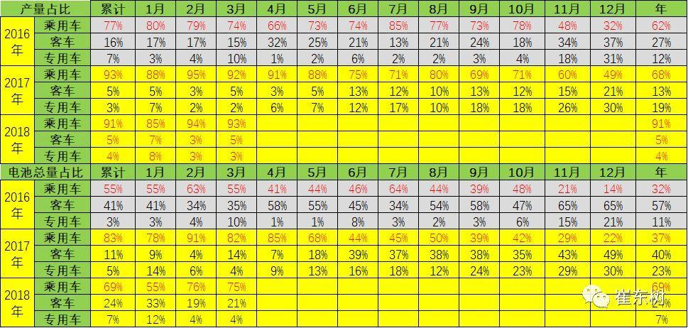 18年客車需求恢復(fù)較快,客車仍是電池需求的重要主力。從產(chǎn)量結(jié)構(gòu)的變化看,18年3月的客車產(chǎn)量占比5%,但3月的客車用電池占比達(dá)到21%,相對(duì)17年3月的14%電池用量改善很大。 17年乘用車總體看是占產(chǎn)量需求的68%和電池需求的37%,18年乘用車總體看是占產(chǎn)量需求的91%和電池需求的69%,仍是引領(lǐng)消費(fèi)增長(zhǎng)的核心動(dòng)力。18年的客車和專用車產(chǎn)量恢復(fù)較好。 4 、3月的電池需求特征