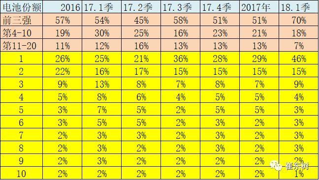 電池企業(yè)集中度逐步提升,16年前三強(qiáng)企業(yè),達(dá)到總電池份額的57%,18年上升到70%。第4到10名企業(yè)的份額,相對(duì)保持穩(wěn)定,16年是19%,17年是21%,18年是18%。第11-20名企業(yè),16年份額是11%,17年是13%,18年是7%,出現(xiàn)了萎縮現(xiàn)象。