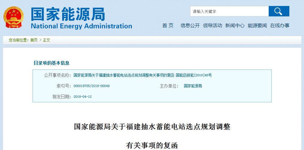 國家能源局關于福建抽水蓄能電站選點規(guī)劃調(diào)整有關事項的復函