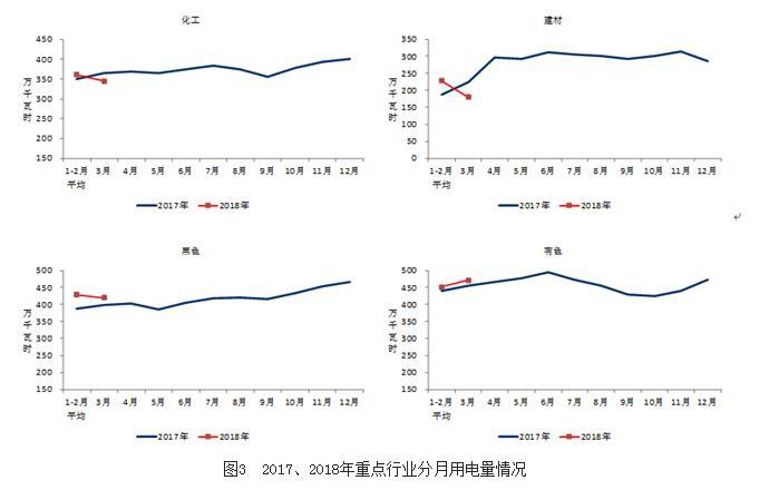 1-3月份,化學(xué)原料制品、非金屬礦物制品、黑色金屬冶煉和有色金屬冶煉四大高載能行業(yè)用電量合計(jì)4353億千瓦時(shí),同比增長(zhǎng)4.8%;合計(jì)用電量占全社會(huì)用電量的比重為27.4%,對(duì)全社會(huì)用電量增長(zhǎng)的貢獻(xiàn)率為14.1%。其中,化工行業(yè)用電量1066億千瓦時(shí),同比增長(zhǎng)2.2%;建材行業(yè)用電量638億千瓦時(shí),同比增長(zhǎng)6.0%;黑色金屬冶煉行業(yè)用電量1277億千瓦時(shí),同比增長(zhǎng)9.6%;有色金屬冶煉行業(yè)1372億千瓦時(shí),同比增長(zhǎng)2.3%。