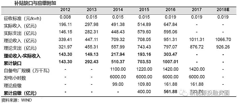 根據(jù)能源局公布的數(shù)據(jù),截至16年底,全國企業(yè)自備電廠裝機容量超過1.42 億千瓦,15 年為1.22 億千瓦,占全國電力總裝機的8.6%。其中,自備燃煤機組裝機容量1.15 億千瓦,占全部自備機組裝機總?cè)萘康?1%。以及發(fā)改委對自備電廠的整治公告顯示:“十二五”期間自備電廠拖欠可再生能源電價附加約為400 億元,據(jù)此我們測算,從2010 年至2017 年自備電廠累計應(yīng)繳附加費約為723.8 億元。由此可見,自備電廠的欠繳費用的確是補貼缺口的重要誘因。