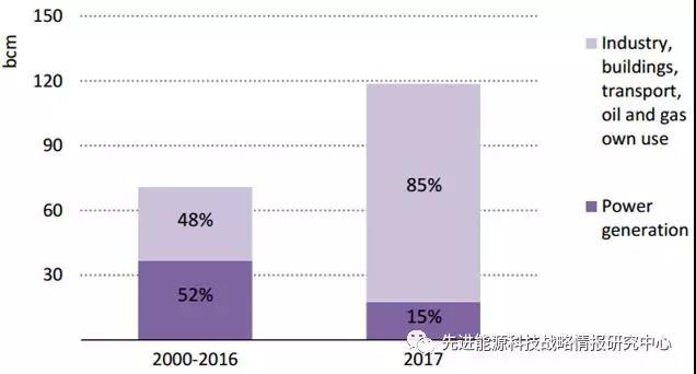 歐盟的天然氣需求也顯著增長(zhǎng)了約160億立方米,主要原因是經(jīng)濟(jì)強(qiáng)勁增長(zhǎng)驅(qū)使行業(yè)需求回升。但歐盟的天然氣消費(fèi)量仍比2010年的歷史峰值低了10%以上。在美國,2017年燃?xì)獍l(fā)電天然氣需求量下降8%,抵消了一大部分世界其他地區(qū)增長(zhǎng)需求。美國去年的情況凸顯了發(fā)電燃料相對(duì)價(jià)格對(duì)電力行業(yè)排放強(qiáng)度發(fā)展趨勢(shì)的影響:2017年天然氣價(jià)格略有上漲,使得燃?xì)獍l(fā)電受到可再生能源和煤炭的擠壓。天然氣需求增長(zhǎng)的構(gòu)成正在發(fā)生變化:在過去的十年中,全球一半的天然氣需求增長(zhǎng)來自電力部門。而在2017年,超過80%的增長(zhǎng)來自工業(yè)和建筑行業(yè),電力部門天然氣需求份額可能逐步下降。