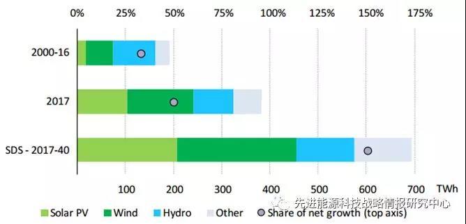 圖4 不同可再生能源電力年度增幅變化態(tài)勢(shì)(SDS-2017-40是IEA 可持續(xù)發(fā)展情景預(yù)測(cè))