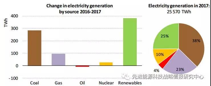2017年,可再生能源新增發(fā)電量380 TWh,占全球新增發(fā)電量的近一半,使其在全球電力構(gòu)成中的份額達(dá)到25%的歷史新高。2017年可再生能源新增發(fā)電量?jī)H次于煤炭,連續(xù)第三年高于天然氣。2017年,全球煤炭發(fā)電量增長(zhǎng)了280 TWh(同比增幅3%),占總增長(zhǎng)的三分之一。亞洲是燃煤發(fā)電量增長(zhǎng)的主要地區(qū),增加了365 TWh。盡管中國和印度在這一增長(zhǎng)中占主導(dǎo)地位,但韓國、日本和印度尼西亞也有顯著貢獻(xiàn),而美國、歐盟、俄羅斯、巴西和南非電力用煤的減少僅能部分抵消亞洲煤炭消費(fèi)的增長(zhǎng)。燃?xì)獍l(fā)電新增95 TWh(同比增幅1.6%),占新增發(fā)電總量約15%;其中美國下降7.6%(-110 TWh),世界其他地區(qū)增長(zhǎng)4.6%(+205 TWh),最重要的貢獻(xiàn)來自歐盟、中國和東南亞。