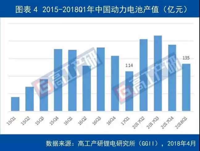 動力電池價格在持續(xù)的下滑,但在出貨量的大幅增長,2018年一季度中國動力電池產值達到135億元,同比增長18.42%。動力電池產值增速遠低于出貨量增速,主要因為新能源補貼政策進一步退坡,補貼力度大幅下滑,主機廠將部分成本壓力轉嫁到動力電池,使動力電池價格繼續(xù)下滑。