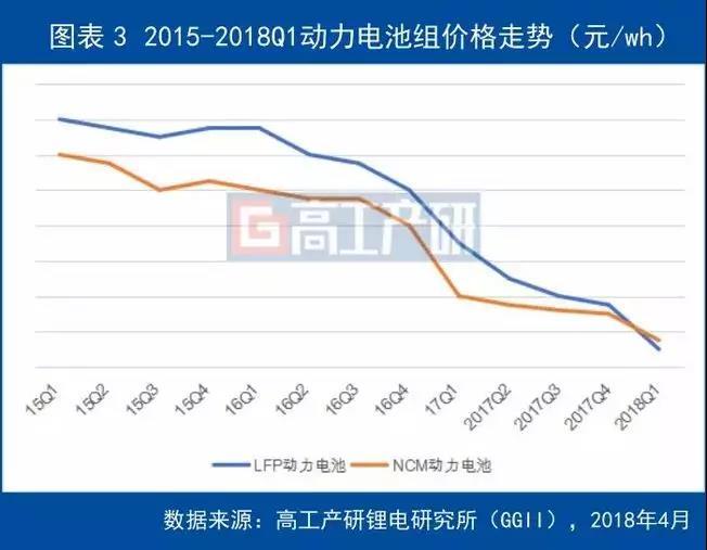 在新能源汽車補貼政策不斷退坡的大背景下,動力電池企業(yè)價格壓力增大,動力電池價格持續(xù)下行趨勢不減。2018年第一季度,NCM三元動力電池價格降幅最大,達10%,目前已降至1.35元/wh。