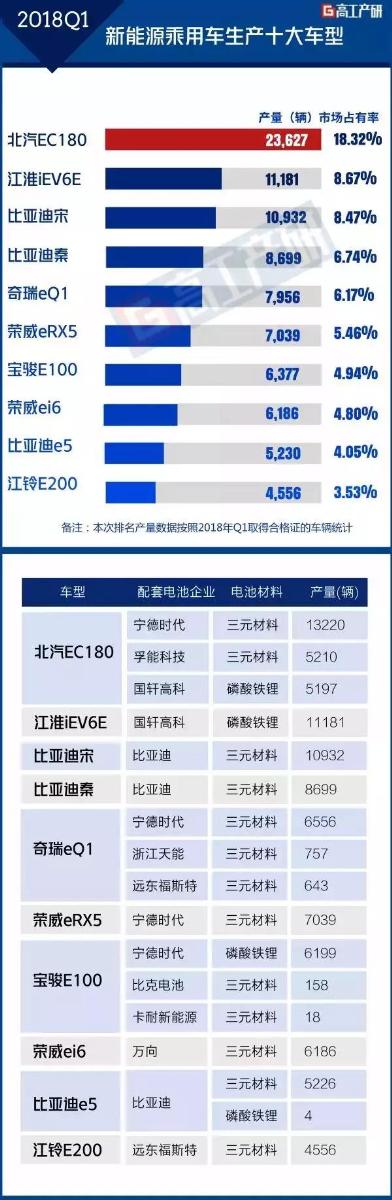 GGII發(fā)布的《新能源汽車產(chǎn)業(yè)鏈數(shù)據(jù)庫》統(tǒng)計(jì)顯示,2018年Q1我國新能源乘用車生產(chǎn)約12.9萬輛,同比增長196%。其中,產(chǎn)量前十車型總生產(chǎn)約9.2萬輛,占乘用車整體的71%。