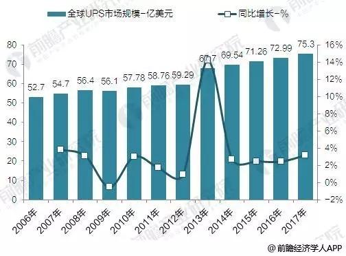 圖1 2006-2017年全球UPS市場規(guī)模走勢圖(單位:億美元,%)