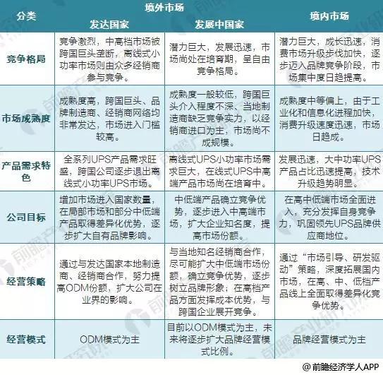 而大部分發(fā)展中國家的市場成熟度較低,小功率UPS市場需求巨大,在線式UPS中高端產(chǎn)品市場尚處于培育期,跨國UPS巨頭對當(dāng)?shù)厥袌鼋槿氤潭炔簧?,本土制造廠商缺乏競爭實(shí)力,因此,市場競爭以經(jīng)銷商進(jìn)口產(chǎn)品為主,市場呈自由競爭格局。鑒于發(fā)展中國家市場潛力巨大,發(fā)展迅速,且市場進(jìn)入門檻不高,公司采取與當(dāng)?shù)刂?jīng)銷商合作的策略,盡可能擴(kuò)大中低端市場份額,確立差異化競爭優(yōu)勢,逐步樹立自有品牌形象,并在中高檔產(chǎn)品方面發(fā)揮比較成本優(yōu)勢,積極與跨國企業(yè)展開競爭。