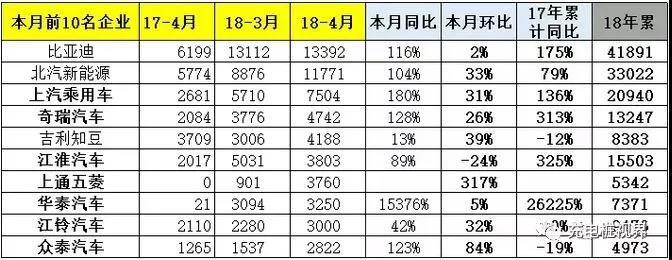 車企方面,比亞迪以4月銷售13392輛排名第一,同比增速116%,1-4月累計銷售41891輛,是截至目前的2018年銷量榜單冠軍企業(yè);排名第二的為單月銷量11771臺的北汽新能源,同比增長104%;上汽則以單月銷量7504臺排名第三,同比增速180%,1-4月累計銷量20940臺。從銷量榜單排名看,4月單月銷量排行的前三名與2018年的累計銷量排名一致。