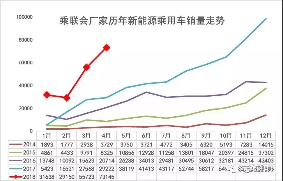 2018年新能源乘用車市場走勢呈現(xiàn)開門紅的特征,1月份的新能源乘用車,銷量達到31638臺,同比增長483%。新能源車市場在2月份走勢也是一個較強的態(tài)勢,相對于歷年的2月份的低迷,一般年初銷量呈現(xiàn)一個低基數(shù)超高速增長的態(tài)勢,今年2月2.9萬臺的規(guī)模,應(yīng)該說是表現(xiàn)良好的。3月銷量達到55723臺,4月進一步拉升到73145臺,相對于17年的4月的平緩走勢,走強力度很猛,體現(xiàn)了新能源乘用車在政策穩(wěn)定后的發(fā)展動力較強。