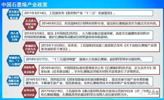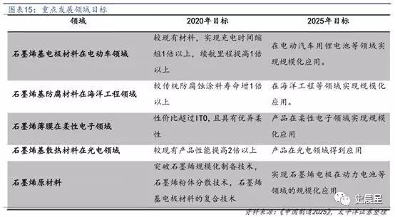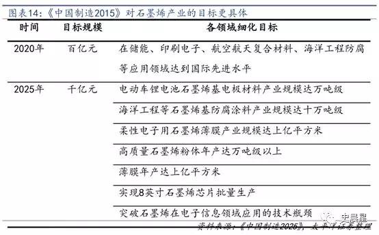 《中國(guó)制造 2025》明確了石墨烯發(fā)展目標(biāo),2020 年“規(guī)模制備及電化學(xué)儲(chǔ)能、印刷電子、航空航天用輕質(zhì)高強(qiáng)復(fù)合材料、海洋工程防腐等應(yīng)用領(lǐng)域的技術(shù)水平達(dá)國(guó)際領(lǐng)先,大幅提升相關(guān)產(chǎn)品性能,形成百億元產(chǎn)業(yè)規(guī)模,2025 年突破石墨烯在電子信息領(lǐng)域應(yīng)用的技術(shù)瓶頸,整體產(chǎn)業(yè)規(guī)模突破千億。