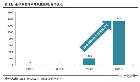 但石墨烯作為基礎(chǔ)材料,下游應(yīng)用領(lǐng)域極為廣闊,美國(guó) BCC Research 預(yù)測(cè),2018 年全球石墨烯整體市場(chǎng)規(guī)??赡芨哌_(dá) 1.95 億美元,2023年石墨烯應(yīng)用規(guī)模將達(dá)到 13.43 億美元,復(fù)合增長(zhǎng)率 47%。