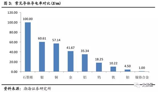 石墨烯作為理想二維晶體材料,電子運(yùn)動(dòng)速度達(dá)到光速的1/300,電導(dǎo)率可達(dá) 10^6 ??/m,是室溫下最好的導(dǎo)電材料,性能超過已知最好的導(dǎo)體銀或銅。