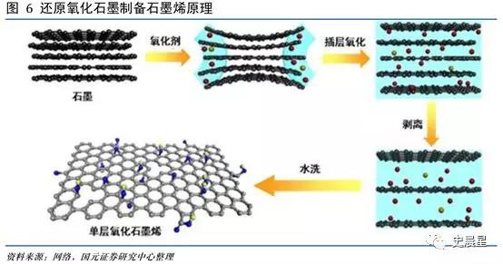基本原理:先利用強(qiáng)氧化劑(高錳酸鉀、濃硫酸)與溶液中石墨反應(yīng),使石墨片層間帶上羧基、羥基等基團(tuán),生成氧化石墨。隨后將氧化石墨分散于溶劑或水中,使用超聲波振蕩處理,形成分散均勻的單層氧化石墨烯分散液。接著使用不同的還原劑或還原方法對(duì)氧化石墨烯進(jìn)行還原,以除去片層上的大多數(shù)含氧官能團(tuán),最后得到石墨烯。