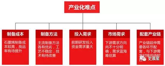 石墨烯產(chǎn)業(yè)化難點(diǎn)主要體現(xiàn)在市場(chǎng)需求不明確、研發(fā)投入大、制備成本高。