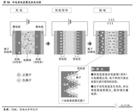 超級(jí)電容器可以被視為懸浮在電解質(zhì)中的兩個(gè)無(wú)反應(yīng)活性的多孔電極板,在極板上加電,正極板吸引電解質(zhì)中的負(fù)離子,負(fù)極板吸引正離子,形成兩個(gè)容性存儲(chǔ)層。