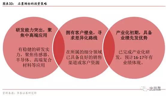 針對(duì)石墨烯產(chǎn)業(yè)的當(dāng)前特點(diǎn),建議重點(diǎn)關(guān)注研發(fā)實(shí)力雄厚,具備產(chǎn)品質(zhì)量和客戶資源壁壘,或者在產(chǎn)業(yè)化階段已經(jīng)占據(jù)先發(fā)優(yōu)勢(shì)的石墨烯標(biāo)的。