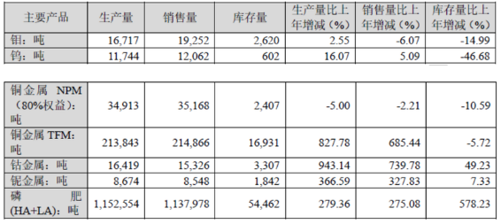 洛陽(yáng)鉬業(yè)2017年產(chǎn)銷(xiāo)量情況分析表:
