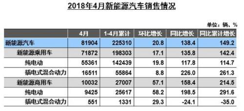 中國儲能網(wǎng)訊:本周,中汽協(xié)與中國充電聯(lián)盟相繼發(fā)布新能源汽車市場數(shù)據(jù)。根據(jù)中汽協(xié)發(fā)布2018年4月份汽車產(chǎn)銷數(shù)據(jù)顯示,今年4月新能源汽車產(chǎn)銷量分別為8.1萬輛和8.2萬輛,同比增長分別為117.7%和138.4%;1-4月累計(jì)銷售新能源汽車22.5萬輛,同比增長149.2%。