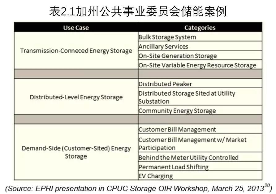 加州公共事業(yè)委員會(huì)儲(chǔ)能行動(dòng)R1012007中,一系列儲(chǔ)能應(yīng)用案例得到研究。如表2中所示,加州公共事業(yè)委員會(huì)將采用三個(gè)基本例子。與輸電線相連接的儲(chǔ)能電站,在ISOs的監(jiān)管下可提供電網(wǎng)相關(guān)的輔助服務(wù)和電量市場(chǎng)競(jìng)價(jià)。此外,儲(chǔ)能可作為調(diào)峰容量提供商供應(yīng)系統(tǒng)容量。與配電線相連接的儲(chǔ)能電站可幫助解決區(qū)域特定變電站問(wèn)題(解決電壓?jiǎn)栴}、緩解設(shè)施升級(jí)等),同時(shí)為電網(wǎng)提供輔助服務(wù)。消費(fèi)側(cè)儲(chǔ)能電站,可削減用戶(hù)峰值負(fù)荷、節(jié)省電費(fèi)同時(shí)提高電能質(zhì)量和供電可靠性。