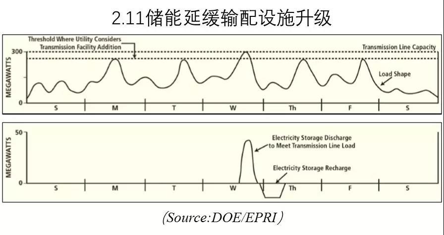 圖2.11表明儲(chǔ)能延緩輸電升級(jí)。儲(chǔ)能在輸電設(shè)施峰值負(fù)荷時(shí)放電,將輸電負(fù)荷降低。