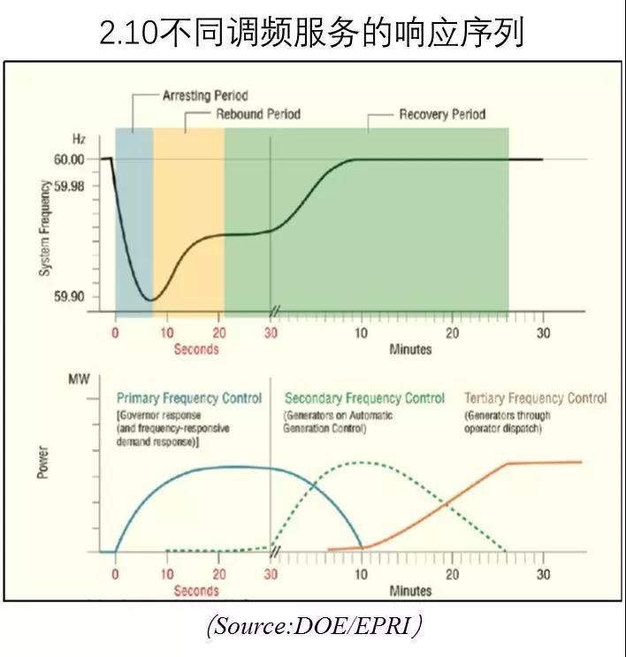 頻率響應(yīng)跟調(diào)頻服務(wù)非常類(lèi)似,但是其響應(yīng)系統(tǒng)時(shí)間更短,當(dāng)電網(wǎng)發(fā)生發(fā)電廠或輸電線掉線的情況下在幾秒到一分鐘范圍實(shí)現(xiàn)響應(yīng)。如圖2.10所示,需要很多發(fā)電設(shè)施響應(yīng)以抵消電網(wǎng)中發(fā)電和負(fù)荷之間不平衡,保證系統(tǒng)頻率和電網(wǎng)穩(wěn)定性。在事故發(fā)生后幾秒內(nèi)最先響應(yīng)的是一次調(diào)頻控制,提高發(fā)電廠的功率輸出。之后半分鐘到幾分鐘時(shí)間內(nèi)二次調(diào)頻控制響應(yīng)AGC信號(hào),其曲線為點(diǎn)狀線。在事故發(fā)生后,電網(wǎng)頻率下降速率跟發(fā)生故障的慣性量占比成正比。
