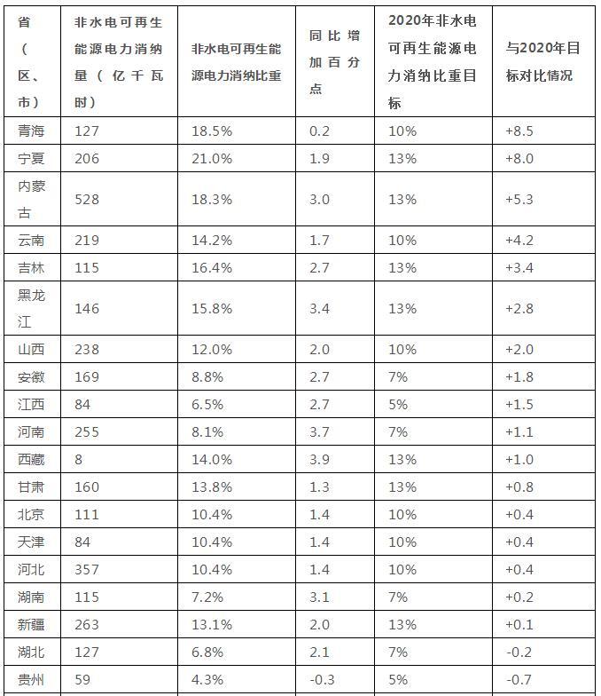 從非水電可再生能源消納比重來看,青海、寧夏、內(nèi)蒙古最高,均超過18%;從非水電可再生能源消納同比增長來看,西藏、陜西、河南三省(區(qū))同比增長較快,分別同比上升了3.9、3.9和3.7個百分點;從完成2020年非水電可再生能源電力消納比重目標(biāo)情況來看,寧夏、青海、內(nèi)蒙古等17個?。▍^(qū)、市)非水電可再生能源消納比重已達(dá)到2020年目標(biāo),湖北、貴州、江蘇、陜西達(dá)到2020年目標(biāo)的75%以上,廣東、海南、重慶低于2020年目標(biāo)的50%。