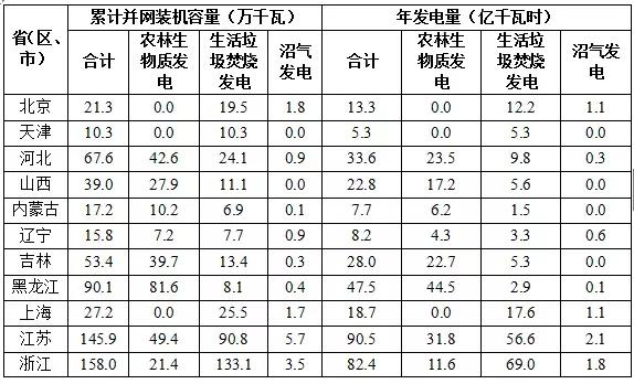 截至2017年底,全國共有30個?。▍^(qū)、市)投產(chǎn)了747個生物質(zhì)發(fā)電項目,并網(wǎng)裝機(jī)容量1476.2萬千瓦(不含自備電廠),年發(fā)電量794.5億千瓦時。其中農(nóng)林生物質(zhì)發(fā)電項目271個,累計并網(wǎng)裝機(jī)700.9萬千瓦,年發(fā)電量397.3億千瓦時;生活垃圾焚燒發(fā)電項目339個,累計并網(wǎng)裝機(jī)725.3萬千瓦,年發(fā)電量375.2億千瓦時;沼氣發(fā)電項目137個,累計并網(wǎng)裝機(jī)50.0萬千瓦,年發(fā)電量22.0億千瓦時。生物質(zhì)發(fā)電累計并網(wǎng)裝機(jī)排名前四位的省份是山東、浙江、江蘇和安徽,分別為210.7萬、158.0萬、145.9萬和116.3萬千瓦;年發(fā)電量排名前四位的省份是山東、江蘇、浙江和安徽,分別是106.5億、90.5億、82.4億和66.2億千瓦時。2017年各?。▍^(qū)、市)各類生物質(zhì)發(fā)電并網(wǎng)裝機(jī)及發(fā)電量如下: