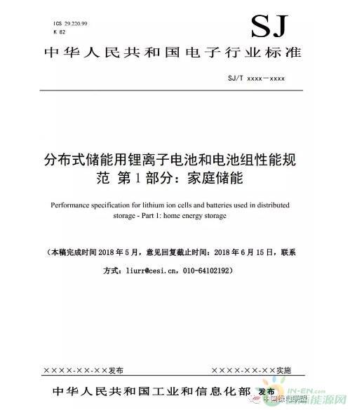 根據(jù)《工業(yè)和信息化部辦公廳關(guān)于印發(fā)2018年第一批行業(yè)標(biāo)準(zhǔn)制修訂和外文版項目計劃的通知》(工信廳科〔2018〕3號),《分布式儲能用鋰離子電池和電池組性能規(guī)范 第1部分:家庭儲能》于2018年1月5日正式立項。該標(biāo)準(zhǔn)由中國電子技術(shù)標(biāo)準(zhǔn)化研究院(賽西,CESI)歸口管理、工信部鋰離子電池安全標(biāo)準(zhǔn)特別工作組負(fù)責(zé)組織起草。