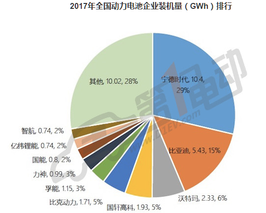 2017年全國(guó)動(dòng)力電池企業(yè)裝機(jī)量(GWh)排行