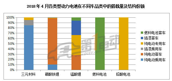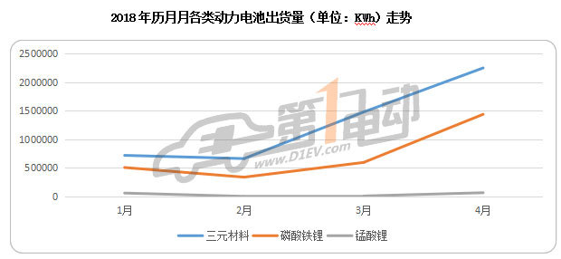 從不同電池類型來(lái)看,4月動(dòng)力電池各類型裝機(jī)量均走高,三元材料電池出貨量2.25GWh,當(dāng)月占比60%、磷酸鐵鋰電池出貨1.44GWh,占比38.27%,再加上出貨量第三的錳酸鋰,三類電池占月度總裝機(jī)量的99%以上。