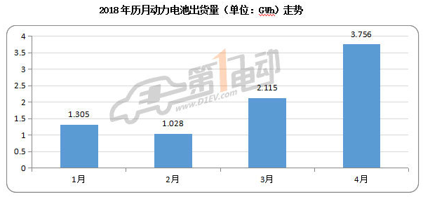 根據(jù)第一電動(dòng)研究院的統(tǒng)計(jì)測(cè)算,2018年4月國(guó)內(nèi)新能源汽車市場(chǎng)動(dòng)力電池裝機(jī)量為3.756GWh,比上月大增77.63%,同比增長(zhǎng)261.56%。
