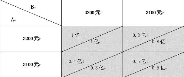 首先,我們假設(shè)每個主機(jī)設(shè)備制造廠只有兩個投標(biāo)價格選擇:3200元和3100元(這是保證風(fēng)機(jī)設(shè)備制造商還有微薄利潤的前提,在此不考慮為了搶占市場打擊競爭對手而采取的非理性策略)。如果一家首先把價格降到3100元,而另一家仍然定價為3200元,那么降價者額外得到30萬千瓦的容量,而另外一家則失去30萬千瓦的容量。這樣降價者售出80萬千瓦的風(fēng)機(jī),而另一家銷售量則降到20萬千瓦;降價者的利潤為(3100-3000)×80萬千瓦=0.8億元,而另一家公司的利潤為(3200-3000)×20萬千瓦=0.4億元。