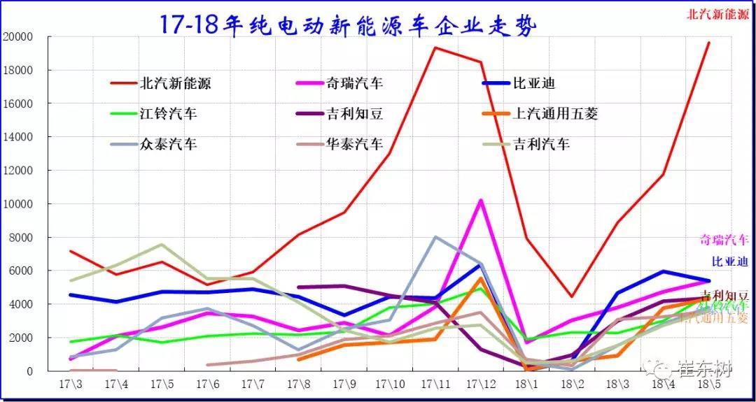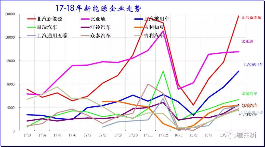 17年的新能源車主要是民營(yíng)企業(yè)的超強(qiáng)表現(xiàn),眾泰、吉利、比亞迪的表現(xiàn)超強(qiáng)。而北汽新能源和江淮的走勢(shì)相對(duì)平穩(wěn)。