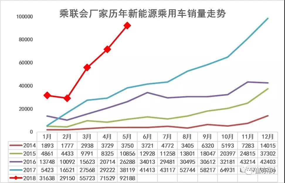 在總體中國(guó)乘用車市場(chǎng)走勢(shì)年初高、隨后持續(xù)下行到夏季谷底的正常走勢(shì)下,新能源乘用車呈現(xiàn)頑強(qiáng)的月度環(huán)比向上趨勢(shì)。2018年新能源乘用車市場(chǎng)走勢(shì)呈現(xiàn)開門紅的特征,1月份的新能源乘用車,銷量達(dá)到31638臺(tái),同比增長(zhǎng)483%。因?yàn)榇汗?jié)因素,今年2月2.9萬(wàn)臺(tái)的規(guī)模,應(yīng)該說是表現(xiàn)良好的。3月政策明朗后的銷量暴增到5.57萬(wàn)臺(tái),4月進(jìn)一步拉升到7.2萬(wàn)臺(tái),5月拉升到9.2萬(wàn)臺(tái),相對(duì)于17年的5月的平緩走勢(shì),走強(qiáng)力度很猛,體現(xiàn)了新能源乘用車在政策明朗后的階段性發(fā)展動(dòng)力較強(qiáng)。