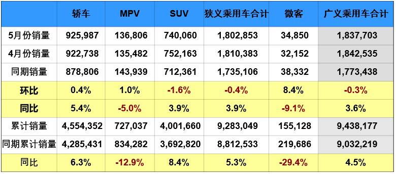 6月8日,全國乘用車市場信息聯(lián)席會(以下簡稱“乘聯(lián)會”)發(fā)布數(shù)據(jù)顯示:5月,我國狹義乘用車銷量為1802853輛,環(huán)比微降0.4%,同比增長3.9%;1-5月,我國狹義乘用車?yán)塾嬩N量9283049輛,同比增長5.3%。乘聯(lián)會方面表示,今年5月汽車銷量環(huán)比增速較去年同期大幅下滑,零售走勢不如預(yù)期。