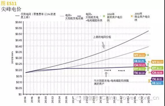 用戶通過投資聯(lián)網的太陽能發(fā)電設施和太陽能發(fā)電+電池儲能系統(tǒng),可以獲得最低成本的電力服務,從而有效地控制用電成本。無論今后零售電力價格多高,聯(lián)網的太陽能發(fā)電設施和太陽能發(fā)電+電池儲能系統(tǒng)的平準化成本都將保持穩(wěn)定,從而使得用戶的電費保持在或低于“尖峰電價”水平,在有些情況下,將大幅節(jié)省他們每個月的電費。在我們分析的幾個地區(qū)里,無論今后電網提供的零售電力價格有多高,商業(yè)用戶的尖峰電價將穩(wěn)定在每千瓦時0.10至0.30美元,居民用戶穩(wěn)定在0.20至0.35美元。例如,根據預測,紐約州韋斯切斯特縣中等消費水平的居民用戶2030年使用大電網的平均月度電費將達357美元,而通過安裝太陽能發(fā)電+電池儲能系統(tǒng),月度尖峰電費則為268美元。 (由于輸電、配電維護和集中式發(fā)電而產生的電網成本,以及無法或未投資太陽能發(fā)電+電池儲能系統(tǒng)的電網用戶所承擔的成本,都是重要的相關問題,但不在本報告的分析范圍內。