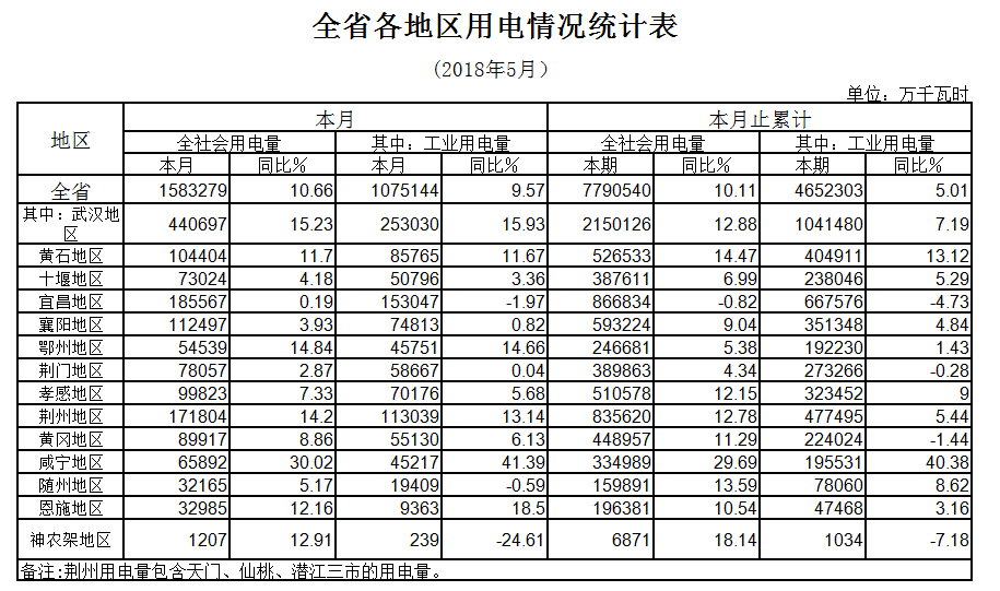(五)各地區(qū)全社會(huì)用電普遍增長,一半地區(qū)用電增速在兩位數(shù)以上。5月份,全省14個(gè)用電統(tǒng)計(jì)地區(qū)全社會(huì)用電普遍增長,其中武漢、黃石、荊州、咸寧等7個(gè)地區(qū)全社會(huì)用電增幅超過兩位數(shù)。從工業(yè)用電情況看,11個(gè)地區(qū)用電不同程度增長,其中武漢等6個(gè)地區(qū)工業(yè)用電增速超過兩位數(shù),僅宜昌、隨州、神農(nóng)架林區(qū)3地下降。