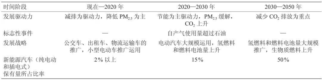 第二階段:2020 - 2030 年,以節(jié)能為主要驅(qū)動力,PM 2.5 得到有效控制,CO2 排放有所上升。在全社會各領(lǐng)域大規(guī)模推廣應(yīng)用純電動與插電式混合動力汽車,同時實現(xiàn)燃料電池汽車的產(chǎn)業(yè)化并達到一定的產(chǎn)銷規(guī)模。大力研發(fā)、成熟應(yīng)用清潔發(fā)電及氫燃料制備(如利用自產(chǎn)可燃冰等資源發(fā)電、制氫)等技術(shù),實現(xiàn)自產(chǎn)氣、可燃冰等資源用量超過石油用量。到 2030 年,新能源汽車年產(chǎn)銷量達 2000 萬輛,市場占比為 50% 左右,占我國汽車總保有量的 15%。