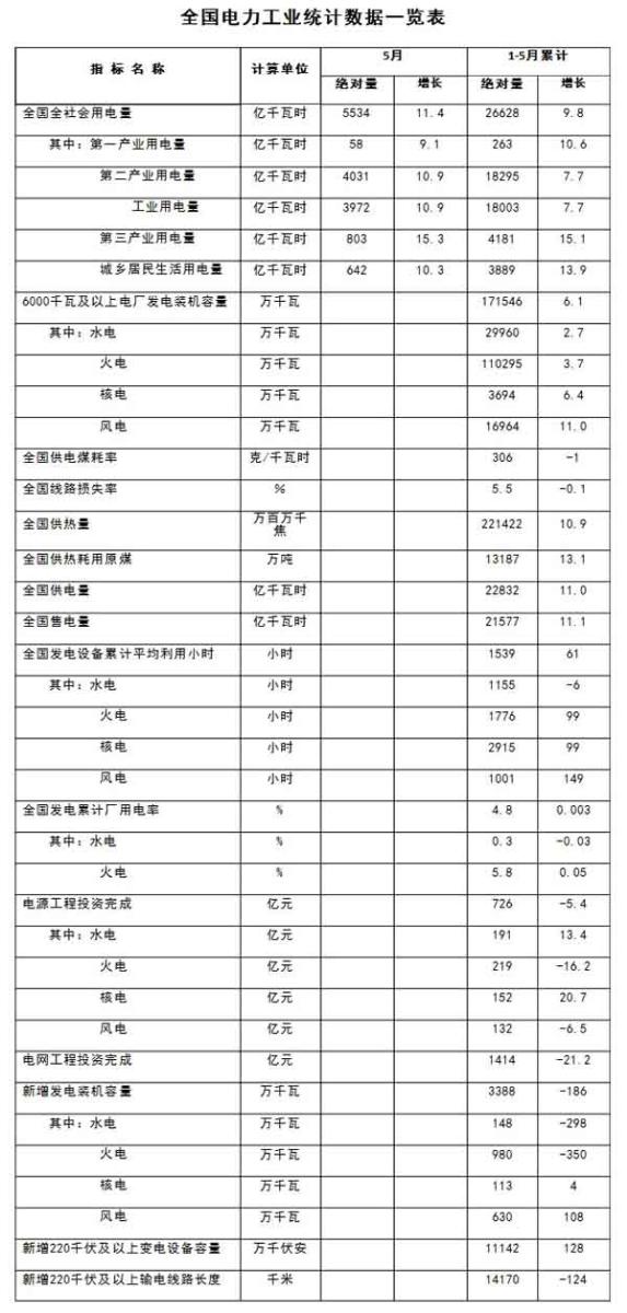 1-5月,全社會(huì)用電量累計(jì)26628億千瓦時(shí),同比增長9.8%。分產(chǎn)業(yè)看,第一產(chǎn)業(yè)用電量263億千瓦時(shí),同比增長10.6%;第二產(chǎn)業(yè)用電量18295億千瓦時(shí),同比增長7.7%;第三產(chǎn)業(yè)用電量4181億千瓦時(shí),同比增長15.1%;城鄉(xiāng)居民生活用電量3889億千瓦時(shí),同比增長13.9%。