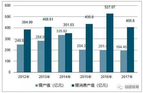 2017年中國(guó)鎳產(chǎn)值為194.45億元,同比下降3.45%;2016年中國(guó)鎳產(chǎn)值為201.4億元。2017年中國(guó)鎳消費(fèi)產(chǎn)值為405.6億元,同比下降23.05%;2016年中國(guó)鎳消費(fèi)產(chǎn)值為527.07億元。