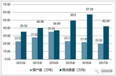2012-2017年中國(guó)鎳產(chǎn)量及消費(fèi)量