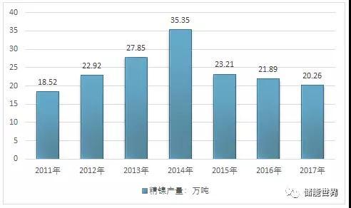 2015年我國(guó)鎳精礦(鎳含量)產(chǎn)量約9.29萬(wàn)噸,同比2014年的10萬(wàn)噸下降了7.1%。2016年我國(guó)鎳精礦產(chǎn)量下降到9萬(wàn)噸,2017年我國(guó)鎳礦產(chǎn)量為9.44萬(wàn)噸,2017年同期我國(guó)精鎳產(chǎn)量達(dá)到20.26萬(wàn)噸。