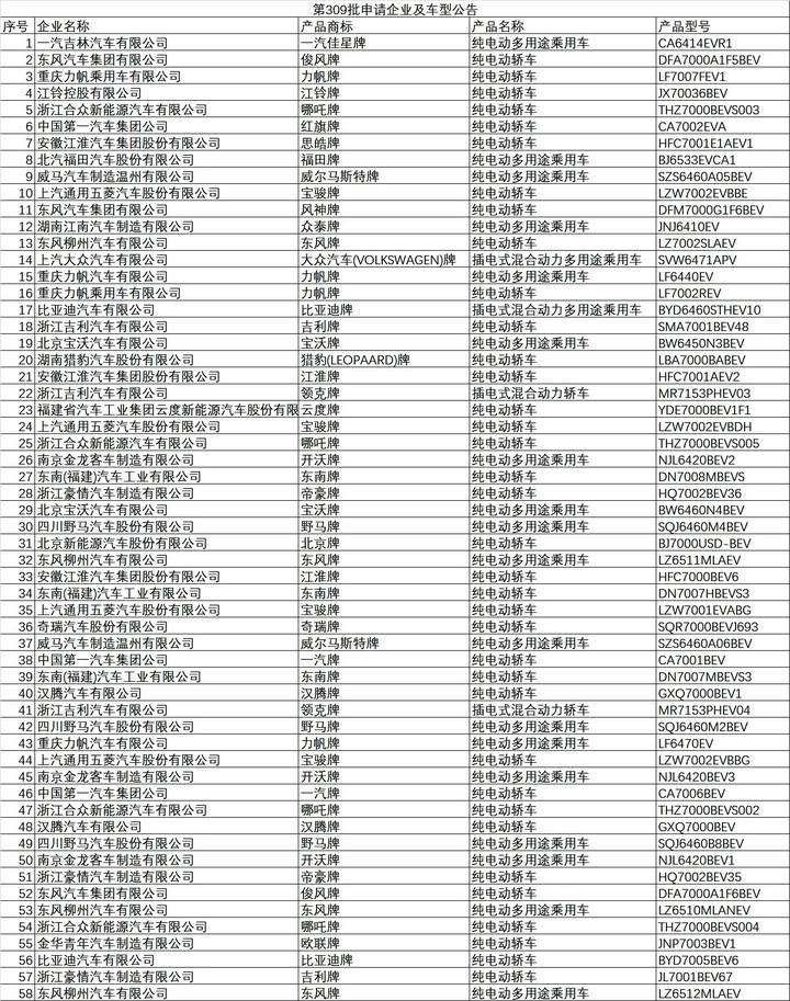 中國儲(chǔ)能網(wǎng)訊:近日,工信部公示了第309批《道路機(jī)動(dòng)車輛生產(chǎn)企業(yè)及產(chǎn)品公告》,申報(bào)新能源汽車產(chǎn)品的共有113戶企業(yè)的426個(gè)型號,其中純電動(dòng)產(chǎn)品共110戶企業(yè)407個(gè)型號、插電式混合動(dòng)力產(chǎn)品共8戶企業(yè)15個(gè)型號、燃料電池產(chǎn)品共4戶企業(yè)4個(gè)型號。其中新能源乘用車總計(jì)58款,包括純電動(dòng)乘用車54款,插電式混合動(dòng)力乘用車4款。