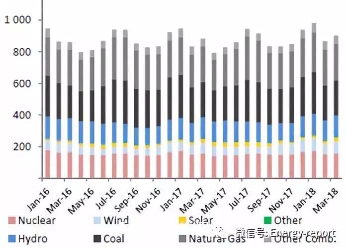 —2018年3月的氣電發(fā)電量同比增長7.3%,同時煤電發(fā)電量同比下降了10.1%。在美國,電力部門中天然氣替代煤最為明顯。