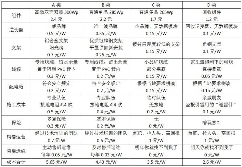 看到這,想必各位也明白,為何我不看好價格太低的戶用光伏系統(tǒng)。部分組件企業(yè)為了清理低端庫存,對270Wp以下組件采用零利潤、負(fù)利潤銷售的方式,剛好滿足一些經(jīng)銷商“低價為王”的銷售策略,形成“平價上網(wǎng)近在眼前”的虛假繁榮。至于可靠性、安全性等追求……都靠邊站吧!