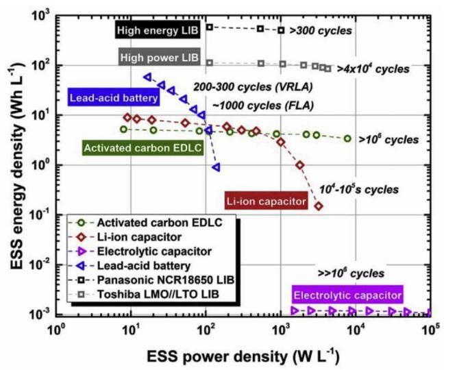 鉛酸電池、鋰電池、鋰離子電容、碳基電化學(xué)雙層電容器EDLC、電解液電容的能量密度、功率密度和充放電壽命等指標(biāo)(圖片源自網(wǎng)絡(luò))