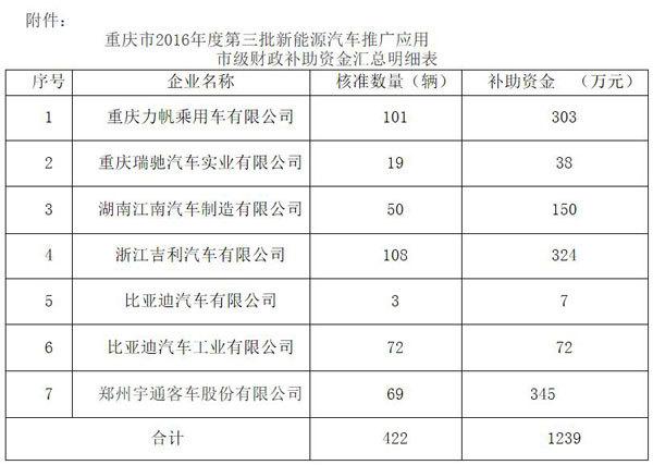 重慶市經(jīng)濟(jì)和信息化委員會(huì)關(guān)于2016年度第三批新能源汽車推廣應(yīng)用市級財(cái)政補(bǔ)助資金的公示
